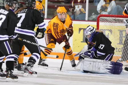 Along with Davis's three-point night, No. 1 Minnesota (21-1-1, 15-1-1-0 WCHA) received two points from junior Rachael Bona (Coon Rapids, Minn.), and junior defenseman Jordyn Burns (Chanhassen, Minn.) scored her first goal of the season. Sophomore goaltender Amanda Leveille (Kingston, Ont.) made 19 saves in her seventh shutout of the year.
