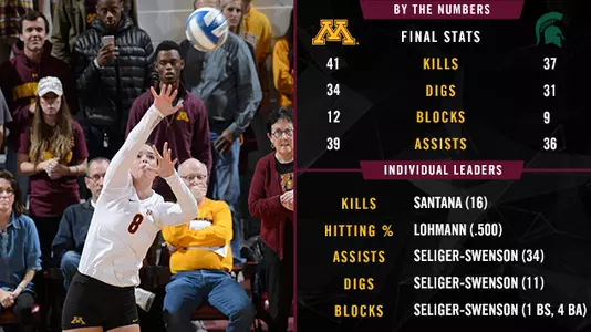 As a team, the Gophers hit .330 to Michigan State's .140, and out blocked the Spartans 12 to 9. Daly Santana lead the match with 16 kills in 31 attempts, hit for .419 and added two blocks. Molly Lohman hit .500 with five kills in 10 attempts, and put up four blocks. Sarah Wilhite added nine kills on the match, and Hannah Tapp followed behind with eight kills. Samantha Seliger Swenson had a match-high 34 assists and 11 digs.