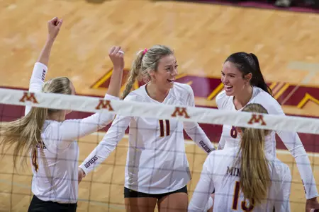 Minnesota was led by Sarah Wilhite with 12 kills and eight digs. Hannah Tapp and Paige Tapp both added five blocks, with H Tapp establishing 11 kills (hit .429) and P Tapp with nine (hit .438). Molly Lohman hit .625, adding a season-best nine blocks. Alexis Hart had seven kills and two blocks. Dalianliz Rosado had 11 digs, while Samantha Seliger-Swenson had five and established 41 assists, five digs and two blocks.