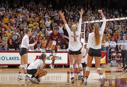 Set 1: Minnesota hit .433 to Northwestern's .139 to take the first set 25-17. Seliger-Swenson started off the match with two aces for the Gophers. After a 4-0 run on Rosado's service rotation, Northwestern called its first timeout at 8-4. Minnesota increased the lead to six, with a block by Wilhite and Lohman forcing a second Wildcat timeout at 15-9. The Gophers would keep their lead throughout the rest of the set, with a Wilhite kill putting Minnesota at set point, and a Northwestern hitting error ending the set.
