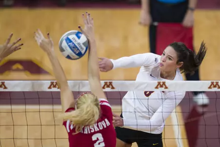 Wilhite averaged 4.20 kills per set and had 42 kills this past week against then-No. 1 Nebraska and No. 3 Wisconsin to close out the regular season. Wilhite hit .296 in that span, while adding four assists, 44 digs. Against Nebraska, she posted 19 kills and a career-high 25 digs as the Gophers erased an 0-2 match deficit. Wilhite followed with a 23-kill, 19-dig performance against No. 3 Wisconsin to close out the regular season. As the Gophers trailed the match, 1-2 to the Badgers, Wilhite had 17 kills, did not commit an error in 27 attempts in the final two sets to push the Gophers to a victory. In the match, Wilhite hit .377 against the Badgers and also added two assists, an ace and a block. The pair of double-doubles this week was her 10th and 11th this season.