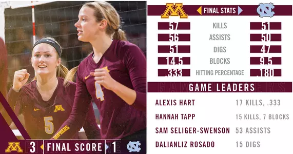 As a team, Minnesota hit .333, had 51 digs and 14.5 blocks, as UNC hit .180, had 51 kills, 47 digs and 9.5 blocks. Individually, Alexis Hart had a career-best 17 kills and hit .333, followed by Hannah Tapp with 15 (hit .417). Sarah Wilhite had a double double (10 kills, 13 digs), while Paige Tapp had nine kills for a .500 efficiency. H Tapp and Molly Lohman each had seven blocks. Samantha Seliger-Swenson had 53 assists and Dalianliz Rosado had a team high 15 digs. Hart and H Tapp were both named to the all-tournament team.
