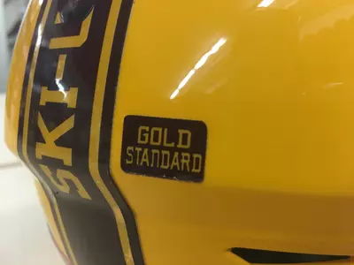 Once Claeys signs off, the equipment staff then affixes small brick-like stickers with the words “Gold Standard” on them to the back of helmets of those who earned them.