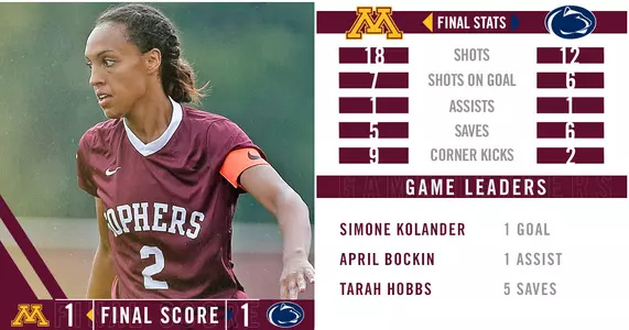 The University of Minnesota women's soccer team tied with No. 16 Penn State in a 1-1 decision on Friday night at the Elizabeth Lyle Robbie Stadium. The game marked the Big Ten Conference opener, and the first time the Gophers have tied this season. Minnesota's record moves to 6-2-1 on the season.