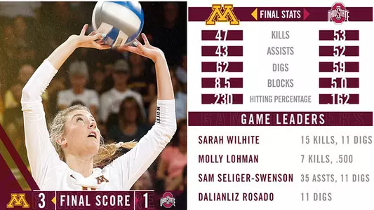 As a team, the Golden Gophers hit .230 to Ohio State's .162, and out-blocked the Buckeyes 8.5 to 5. Minnesota also held a 62-59 dig advantage. Sarah Wilhiteled the team with 15 kills as she hit .316, Alexis Hartfollowed with nine, with Molly Lohmanestablishing seven kills and hit. 500. Dalianliz Rosado, Wilhite and Samantha Seliger-Swensonall had 11 digs, with Sophie Beckleyand Katie Schauearning eight. Seliger-Swenson also had 35 assists and two kills.
