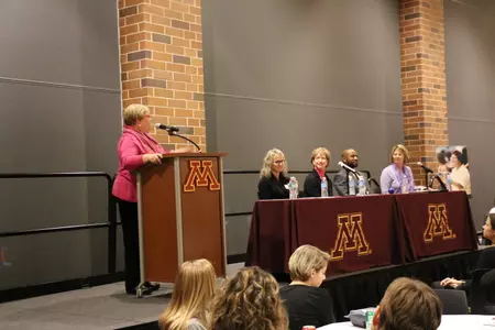 A four-person panel then took center-stage, sharing their thoughts about leadership, mentorship, obstacles female professionals face and advice for Gopher student-athletes. Long-time Gopher supporter and former YWCA Minneapolis Director of Individual and Planned Giving, Julianne Bye, served as the panel's moderator. She was joined by: Co-Director of the Tucker Center, Dr. Nicole LaVoi; Associate Athletics Director Julie Manning; Vice President, Finance & Corporate Treasurer for The Schwan Food Company, Kate Nau, and; Assistant Athletic Director and Student-Athlete Development/Diversity & Inclusion Director, Peyton Owens III.