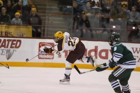 Junior goaltender Eric Schierhorn matched a program record with his 78th consecutive start between the pipes for the Maroon & Gold, making 26 saves on the day. Junior Ryan Norman tallied his first goal of the season in the third for Minnesota's lone score of the game, assisted by junior Darian Romanko and sophomore Ryan Zuhlsdorf.