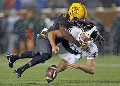 That proved to be a beneficial experience, given the torrential rain that fell sideways in the swirling wind right before the game and during much of the first half. The wet weather was a major factor early. Punter Jake Hartbarger dropped a high snap after a three-and-out by the Spartans on their first possession, and the Gophers jumped on the ball at the 3.