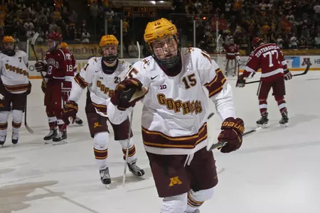 MINNEAPOLIS - After a loss in the home opener last month, the No. 7/6 Gopher Hockey program has now rattled off sixth-straight wins at home with Friday night's 4-2 victory over No. 13/11 Harvard at 3M Arena at Mariucci.
