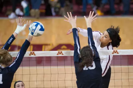 The Gophers were led by Stephanie Samedy who had a double-double with 22 kills and 13 digs. Alexis Hart posted 19 kills while hitting .333, Regan Pittman had 10 kills and three blocks and Molly Lohman put up five of the team's eight blocks. Samantha Seliger-Swenson also completed a double-double this match with her 53 assists and 10 digs, and had two service aces. Alyssa Goehner had a team-high and season best 14 digs, followed by Dalianliz Rosado with 12.