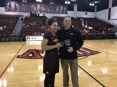 Pitts collected the Lady Rebel Round-Up tournament MVP trophy Sunday in Las Vegas. She totaled 40 points, 22 rebounds and 10 3-pointers in wins against Wake Forest and UNLV. Pitts had a double-double of 18 points and 13 rebounds against the Demon Deacons, and led the Gophers with 22 points while adding nine rebounds against the Lady Rebels.