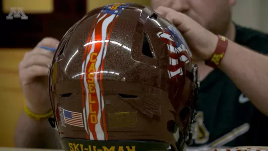 Minnesota's helmets will feature the name of a veteran who is part of the Student Veterans Association, which means that current students who are military veterans will have their name on the back of a helmet. The last name will be featured on the center stripe of the helmet, which will be red, white and blue for Saturday's game. The helmet will also display a logo reflecting the military branch that the individual served.