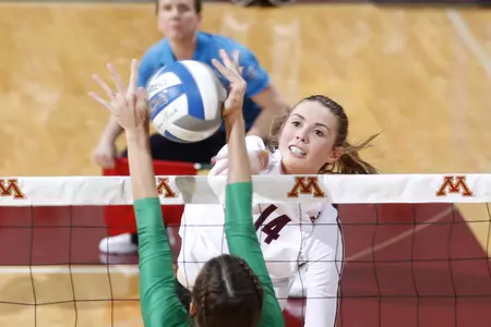 The Gophers were led by Brittany McLean who set a career high 13 kills while hitting .355. Alexis Hart followed with 10 kills and hit .304 and Stephanie Samedy had nine. Molly Lohman tied her career high of three aces and Regan Pittman led the team with four blocks. Samantha Seliger-Swenson posted a double-double with a team-high 20 digs and 30 assists while Dalianliz Rosado had 15 digs and a career high 11 assists. As a team, the Gophers hit .260 to North Dakota's .140 and had 48 kills.
