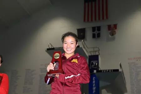 Zhou scored 392.75 points on the 3-meter board to wrap up her collegiate career with a second national championship, and the ninth individual title in program history. She won her first in 2015, and tallied a total of seven top-five NCAA finishes in her three years at Minnesota. Lexi Tenenbaum placed fourth at 362.00 and Sarah Bacon sixth at 347.25 to give the Gophers three All-Americans in the event.