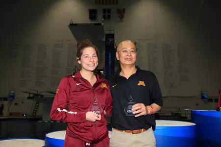 Gopher diving stood out all week, as senior Yu Zhou won the 3-meter title Friday and she and Sarah Bacon were All-Americans on both springboards. Chen earns the CSCAA's Coach of the Year nod for the third time. He has coached his Minnesota divers to four national titles, including two by Zhou.