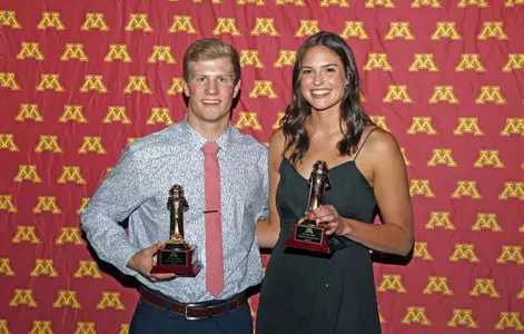 Baseball's Cody Campbell and women's track & field's Nicolle Murphy were awarded the Land O'Lakes Outstanding Achievement Award in Leadership and Service. Selected by the Land O'Lakes committee, this award is given to one male and one female student-athlete who are accomplished in the areas of leadership and volunteerism. A pitcher for the Gopher baseball team, Campbell's resume continues off the mound. He is a senior psychology major who also found time to volunteer more than 300 hours in the local community. Campbell added internships within Gopher Athletics and Be the Match this past summer. Murphy is a senior sports management major and has volunteered for more than 140 hours in her community. She organized the Wellness Corps program, which is a partnership with the Midwest Dairy Council. Together, they work closely within the Twin Cities area with a focus on healthy lifestyles.