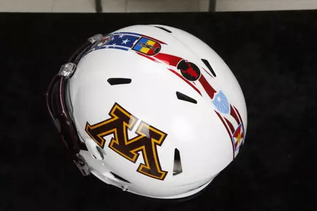 Minnesota will wear special helmets on Saturday as it hosts a Salute to Service members game against Maryland at 11 a.m. at TCF Bank Stadium. The helmets pay tribute to Minnesota's National Guard and each helmet features six decals that will be displayed along a patriotic center stripe. The Minnesota National Guard logo will be displayed at the front of the helmet. The logo on the back of the helmet belongs to the USS Minnesota, which is a fast-attack submarine that was commissioned in 2013. Each helmet has four logos adorned along the stripe between the Minnesota National Guard mark and the USS Minnesota logo. The four logos in the middle of the stripe recognize a unit or subsection of the Minnesota National Guard. Gopher fans generously donated 544 tickets to military personnel to coincide with Minnesota's Salute to Service initiative on Saturday. Those tickets were then distribute by Beyond The Yellow Ribbon.
