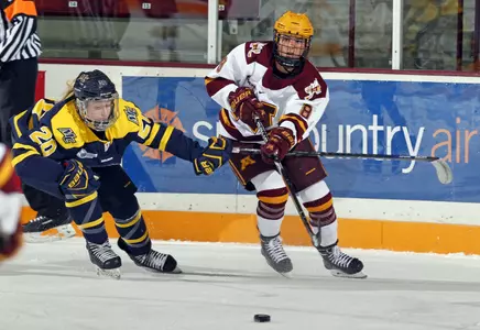 Freshman Grace Zumwinkle scored her first career-goal with a power-play goal 19:14 into the period to put Minnesota back on top, and fellow rookie Olivia Knolwes followed quickly with her first goal as a Gopher at 19:30.