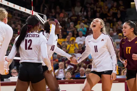 Minnesota was led by Stephanie Samedy, who had 11 kills and hit .348, followed by Alexis Hart with eight and Molly Lohman with seven (.545). Samantha Seliger-Swenson recorded her second double-double of the day when she had 34 assists, 11 digs, three blocks and one ace. In all, Minnesota had 12 student-athletes see action in the win.