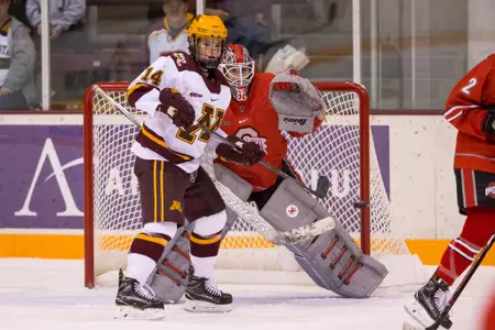 The Gophers rallied for a pair of second-period goals. Woken scored the game-tying goal on the power play off assists from Baldwin and Olivia Knowles at the 5:07 mark of the middle frame before Zumwinkle gave the Maroon & Gold the lead just 3:17 later. Taylor Wente won a faceoff back to Baldwin at the point, where she ripped a slapshot through traffic that Zumwinkle redirected past Sauve.