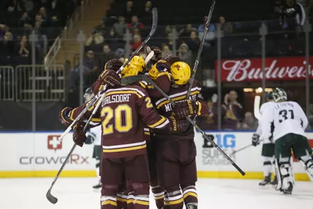 NEW YORK - Playing in the "World's Most Famous Arena", the No. 13/14 Gopher Hockey program completed a weekend sweep over Michigan State with a 2-1 win on Saturday night at Madison Square Garden.