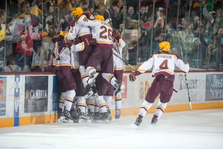 MINNEAPOLIS - Casey Mittelstadt tapped in the game-winning goal in overtime to help the No. 13-ranked Gopher Hockey program knock off No. 1 Notre Dame in the Big Ten series opener on Friday night at 3M Arena at Mariucci.