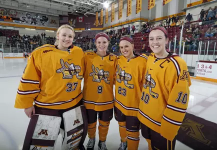 Minnesota (19-8-2, 12-6-2-0 WCHA) honored its four seniors, Peters, Piazza,Sydney Baldwin, and Caitlin Reilly as part of its annual Senior Day prior to Saturday's game, which marked the Gophers' final home game of the regular season. Appropriately, it was the seniors who led the Gophers to victory.