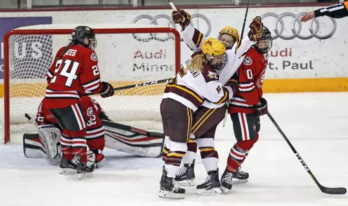 Minnesota (21-10-3) received multiple points from Taylor Williamson (1g-1a), Sydney Baldwin (2a), and Lindsay Agnew (2a) along with Skarzynski's two-goal effort. Nicole Schammel scored her 15th goal of the season, and Alex Woken netted an empty-net goal to round out the Gophers' scoring.