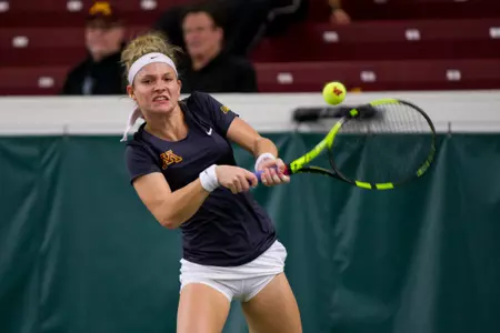 Minnesota trailed 3-2 with two matches remaining in the dual before Barbara Mancera won her No. 5 singles match 6-3, 5-7, 7-5, and Annemarie Emme lost her No. 3 singles match 6-4, 5-7, 7-6 just minutes apart.