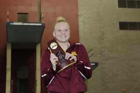 COLUMBUS, Ohio - Sophomore Sarah Bacon dove to a national champion finish on the 1-meter diving board to lead the Gophers All-American performances on day two of the NCAA Women's Swimming and Diving Championships in Columbus. The Gophers are currently in ninth place with 70 points after seven events.