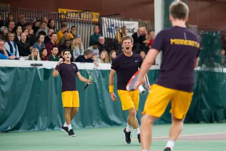 Krstanovic rolled the momentum into singles play as he breezed to a 6-1, 6-1 win at the no. 5 singles position to give the Maroon & Gold a 2-0 edge. Corwin continued his strong play at the no. 1 singles spot, earning a ranked victory as he knocked off no. 117 Constant De La Bassetiere, 6-2, 6-1. Stefan Milicevic clinched it for the Gophers as he rolled to a 6-3, 6-3 win over Christos Antonopoulos, his third-straight victory.