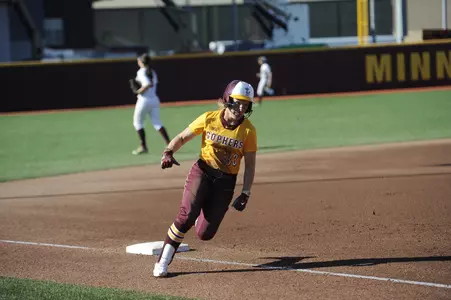 The runs started coming in early for Minnesota who batted around in the first inning with 14 plate appearances. Kendyl Lindaman began her 2-for-3 game driving in the game’s first run scoring MaKenna Partain. In her second at-bat of the inning, Lindaman sent a grand slam over the center field wall to record all five of her RBI in the opening frame. Driving in runs during the inning were Danielle Parlich, Allie Arneson and Ellee Jensen. Senior Sydney Dwyer closed out the half inning with a solo home run to center to make it 11-0.