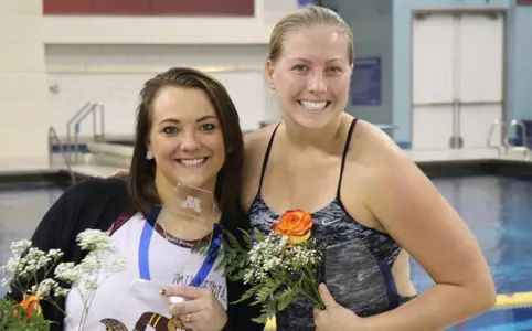 Kelci Bryant and Maggie Keefer comprised the University of Minnesota Aquatics Hall of Fame Class of 2018. The two former Gopher divers were honored midway through the meet by the Minnesota coaching staff and were presented plaques to commemorate the honor. To read more about their accomplishments, click HERE.