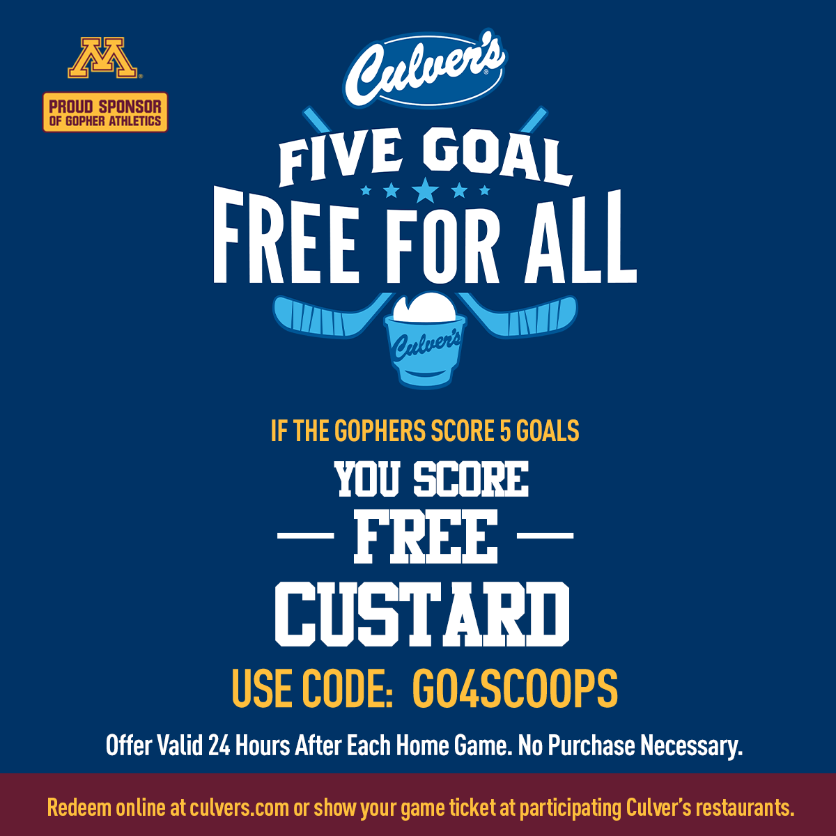 Hey Gopher Fans! Five Goal Free For All is back this season! If the Gophers score 5 goals during any regular season home game you score free Culver’s Custard. Offer valid 24 hours after each home game, no purchase necessary.