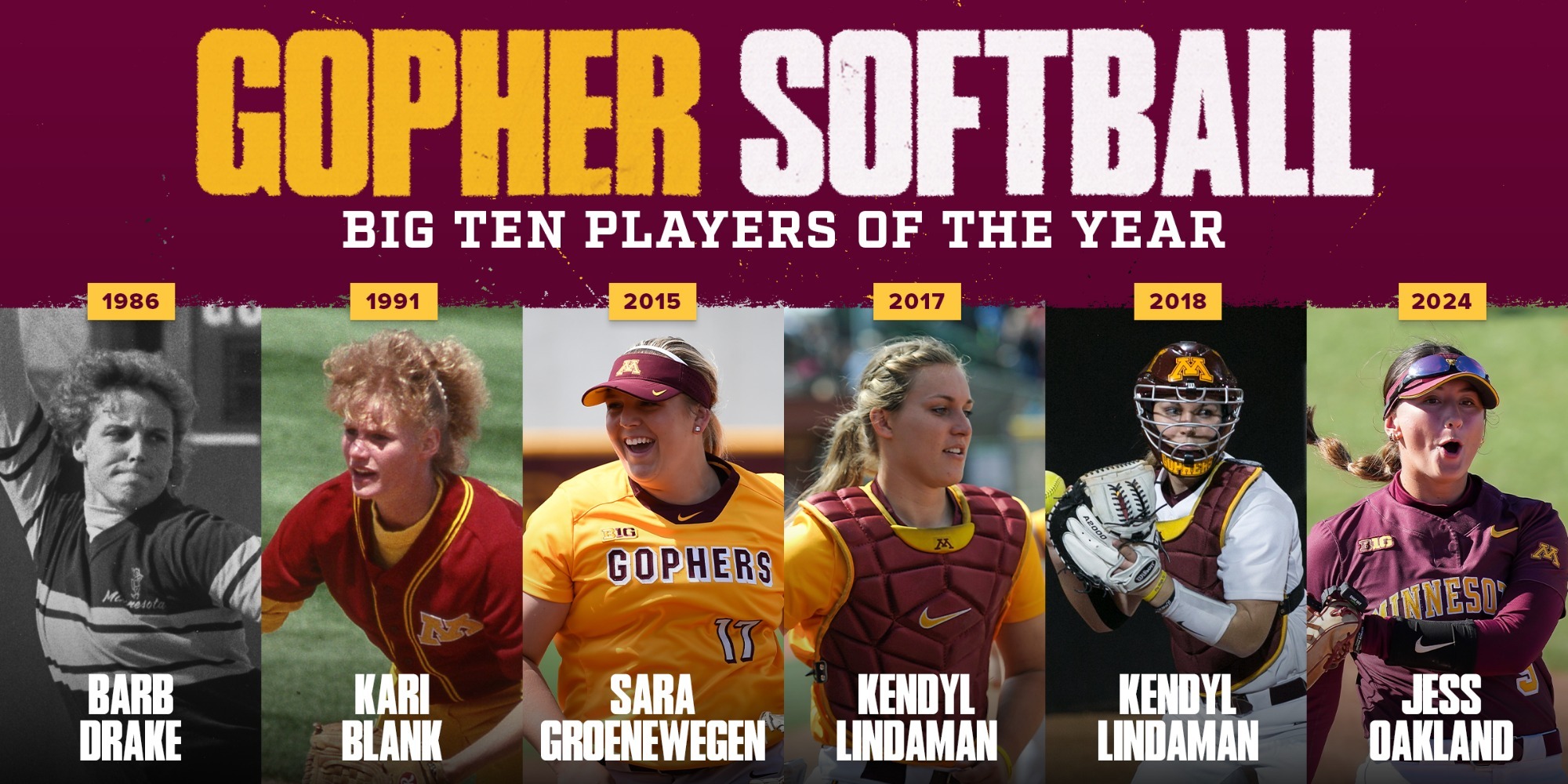 Barb Drake was the first Golden Gopher to be named Big Ten Player of the Year after helping lead Minnesota to its first Big Ten title in 1986. A two-time All-American in 1984 and '86, Drake was inducted into the Minnesota Softball Hall of Fame in 1992 and the M Club Hall of Fame in 2004.