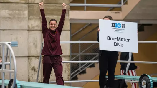 2023-24 Sophomore Season: Platform National Champion ... Platform All-American ... Big Ten Diver of the Year... Second Team All-Big Ten... Big Ten All-Academic Team... CSC Third-Team Academic All-American... Big Ten Diver of the Week (12/6/24)... Minnesota Diver of the Year and Outstanding Student-Athlete award at team banquet... NCAAs: became the first Gopher woman to ever win the platform (327.90), also finished 18th in the 1-meter (265.30) and 23rd in the 3-meter (276.45) ... NCAA Zone Diving: won the 3-meter (688.60) and placed third on 1-meter (622.95) and platform (626.20) ... Big Tens: earned second on platform (342.00), third on 3-meter (344.60) and eighth in the 1-meter (287.45) ... Purdue/Iowa/Northwestern Quad-Dual: won the platform (338.70), placed third on 3-meter (327.60) and fourth on 1-meter (285.95) ... Pitt Dual: won the 3-meter (317.93) and got sixth on 1-meter (268.73) ... Bruin Diving Invitational: won the platform (610.40) and was second in 1-meter (579.95) and 3-meter (617.35) ... Minnesota Invite: won the platform (331.90) and the 3-meter (367.85) and placed second in the 1-meter (290.85) ... Wisconsin Dual: finished second in the 3-meter (296.33) and fourth in the 1-meter (274.88) ... St. Thomas/South Dakota State Tri-Dual: won the 3-meter (353.25) and was fourth in the 1-meter (277.95) ... Nebraska/South Dakota Tri-Dual: won the 3-meter (324.95) and finished sixth on 1-meter (266.75)